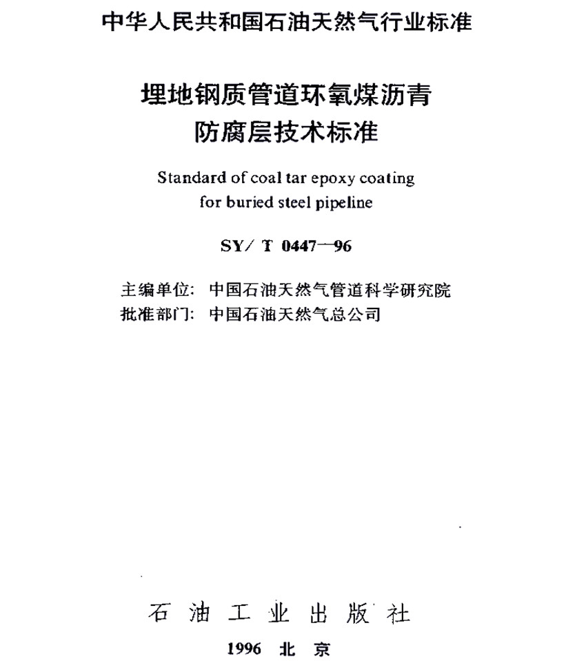 SY/T 0447-96埋地鋼質管道環氧煤瀝青防腐層施工技術要求標準是小編復制SY/T 0447-96《埋地鋼質管道環氧煤瀝青防腐層技術》電子版,可以放心參考。更多防腐涂料防腐涂裝執行的國家標準和行業標準,可以查閱本網站。