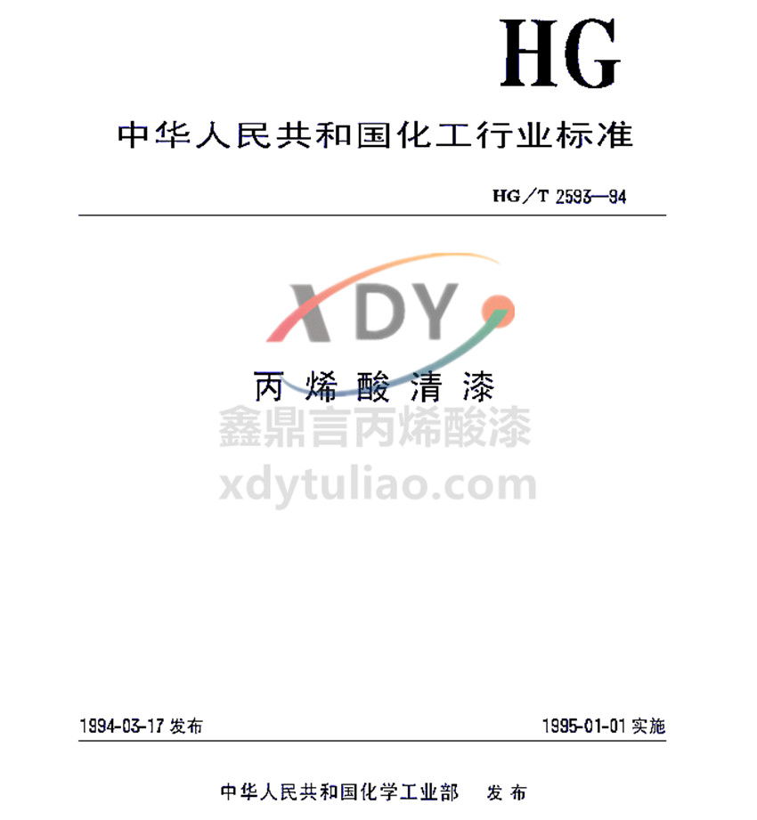 丙烯酸清漆HG/T 2593-1994代替ZBG 51072-87 中華人民共和國化工行業標準 丙烯酸清漆 1994-03-17發布 1995-01-01實施 中華人民共和國化學工業部 發布 本標準規定了丙烯酸清漆的技術要求、試驗方法、檢驗規則、包裝、標志、貯存、運輸等。本標準適用于經陽極化處理的鋁合金或其他金屬表面的裝飾與保護的丙烯酸清漆。本標準規定的丙烯酸清漆分為兩個類型。Ⅰ型產品:由甲基丙烯