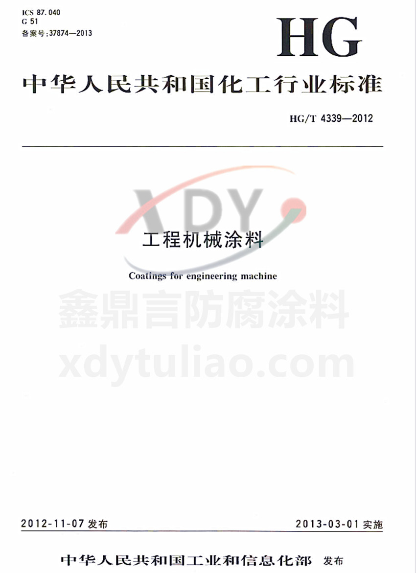 HG/T 4339-2012工程機械涂料標準ICS87.040 G51 備案號:37874-2013 HG 中華人民共和國化工行業標準 HG/T 4339-2012 工程機械涂料Coating for engineering machine 2012-11-07發布 2013-03-01實施 中華人民共和國工業和信息化部 發布 本標準規定了工程機械涂料產品的分類、要求、試驗方法、檢驗規則、標志、包
