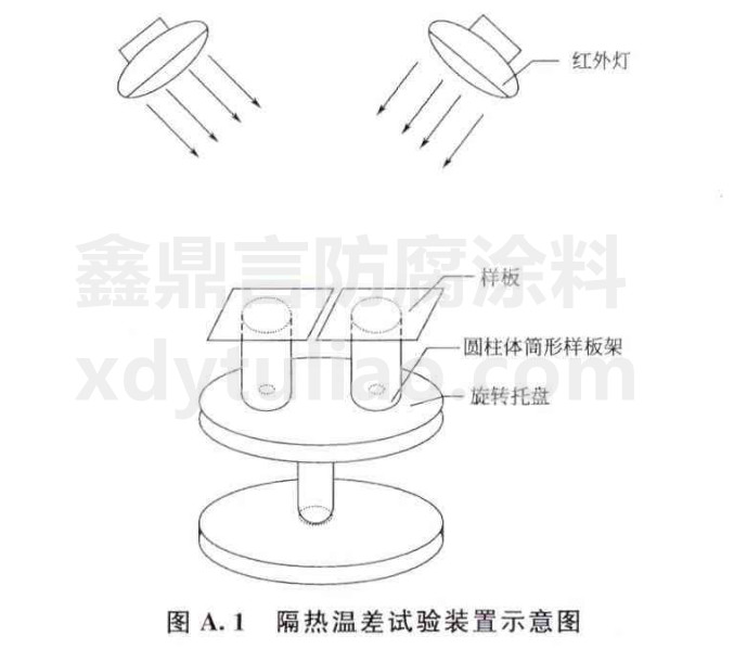 A.3.2、試驗在18℃—27℃的環境條件下進行。在旋轉托盤上放置圓柱體筒形樣板架,圓柱體筒形樣板架的中心應對準托盤上圓孔的中心;將1塊試板及1塊空白試板放在圓柱體筒形樣板架上,兩塊板之間間隔5mm,試板有涂層的面向上,空白試板經過噴砂或拋丸的面向上;在旋轉托盤的上方0.5m處,安裝2只紅外燈,紅外燈與旋轉托盤邊緣的水平距離為15cm,紅外燈的加熱面軸向與試板平面成75°。