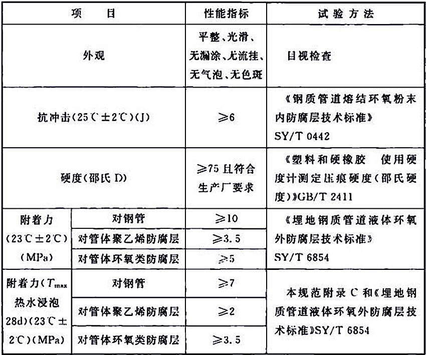 2.2 液體環氧補口防腐層的性能應滿足表2.2-1的要求,液體聚氨酯補口防腐層的性能應滿足表2.2-2的要求。