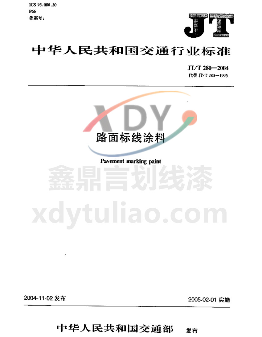 JT/T 280-2004路面標線涂料標準是防腐涂料小編照搬JT/T 280-2004《路面標線涂料》紙質版內容,大家可以放心參考。更多防腐涂料執行國家和行業標準等防腐涂料相關信息可以參考官網:www.zxt618.com.cn ICS 93.080.30 P66 JT 中華人民共和國交通運輸行業標準 JT/T 280-2004路面標線涂料Pavement
