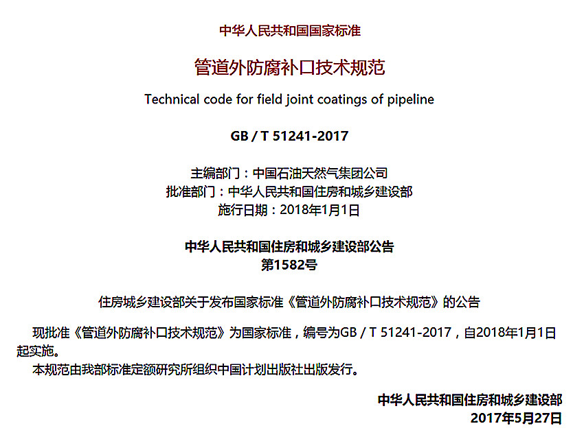 管道外防腐補口技術規范施工工藝標準GB/T 51241-2017